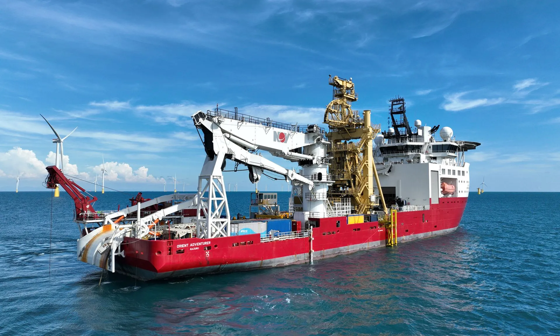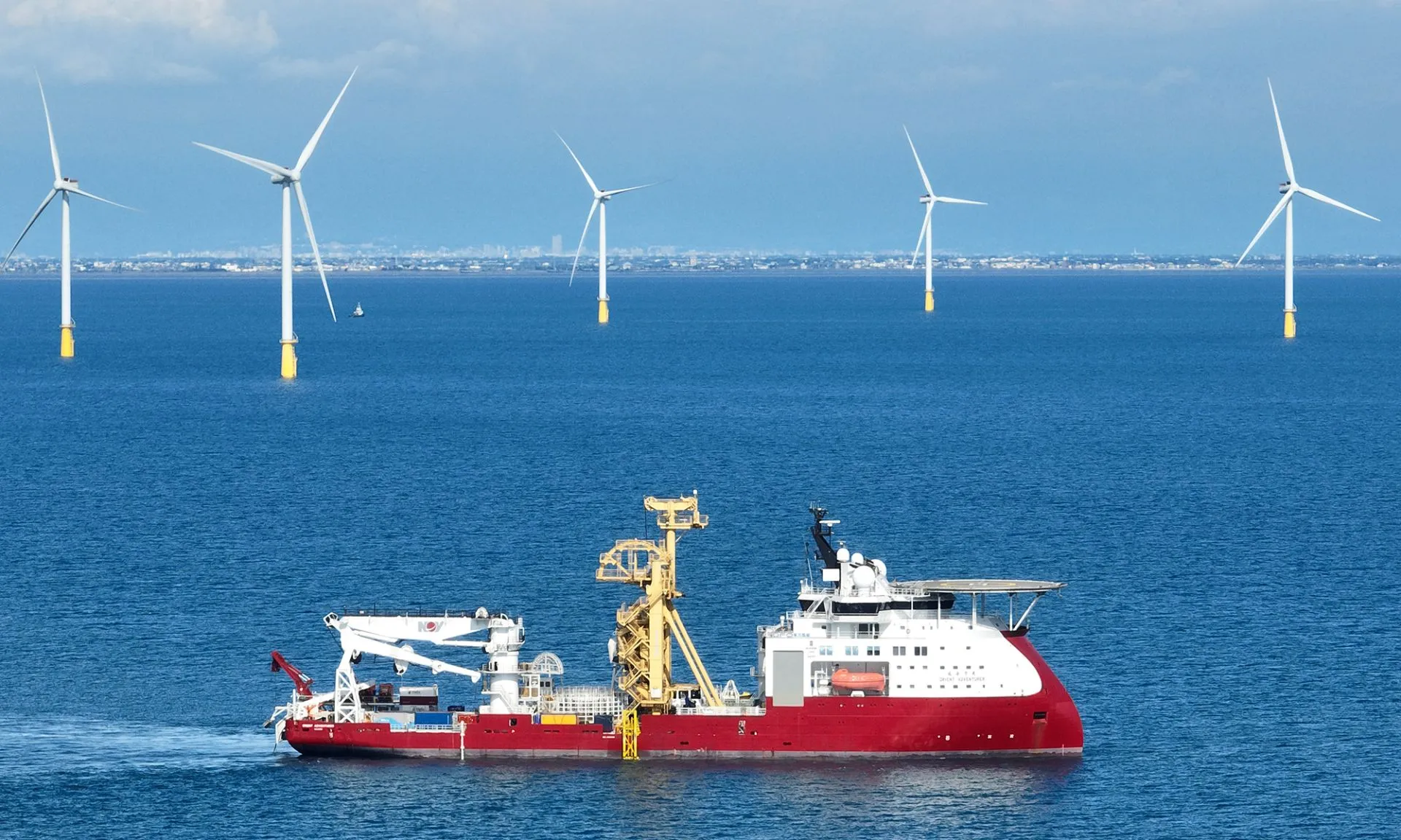 Orient Adventurer As one of the world's top ten cable-laying ships, the Orient Adventurer is Taiwan’s highest-spec offshore engineering vessel. It is 130 meters long and 25 meters wide, equipped with a DP3 dynamic positioning system and a 250-ton active heave-compensated crane. It can carry over 5,000 tons of cable and lay more than 100 kilometers. The vessel also features a 3,000-meter deepwater work-class ROV and supports various offshore wind operations including turbine commissioning, cable testing, trenching, concrete mattress installation, and subsea surveys.